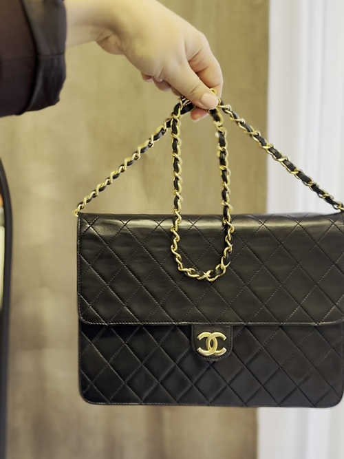 Černá jehněčí kůže, ikonické prošívání a nadčasový tvar dělá z tohoto kousku elegantní a luxusní volbu pro každou příležitost.
